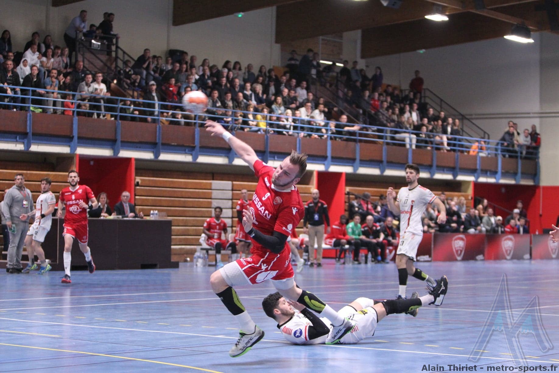 L’équipe d’Aziz Benkahla a longtemps du faire la chasse à des Niçois mieux partie dans la rencontre. Les visiteurs menaient ainsi de 3 points à la pause (11-14) et comptaient même jusqu’à 4 longueurs d’avance au retour des vestiaires (11-15). Mais tout le collectif isérois s’employait pour ne rien lâcher et petit à petit combler l’écart. Ioannou, Dei Negri, Jourdan, Malek et Abdi faisaient à tour de rôle trembler les filets avant qu’un pénalty de Marius Randriantseheno permette à Grenoble d’égaliser (17-17).