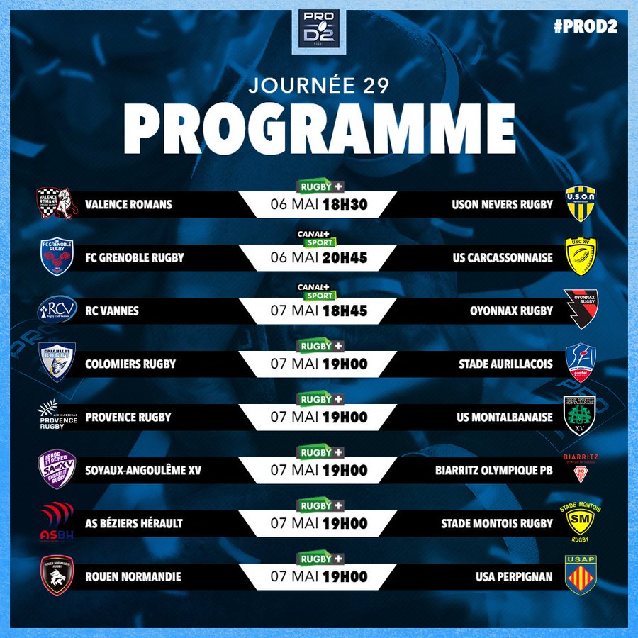 La LNR a communiqué la programmation de la 29ème journée du championnat Pro D2 de rugby. Le FC Grenoble recevra ainsi l’US Carcassonne le jeudi 6 mai prochain, avec coup d’envoi du match à 20h45.