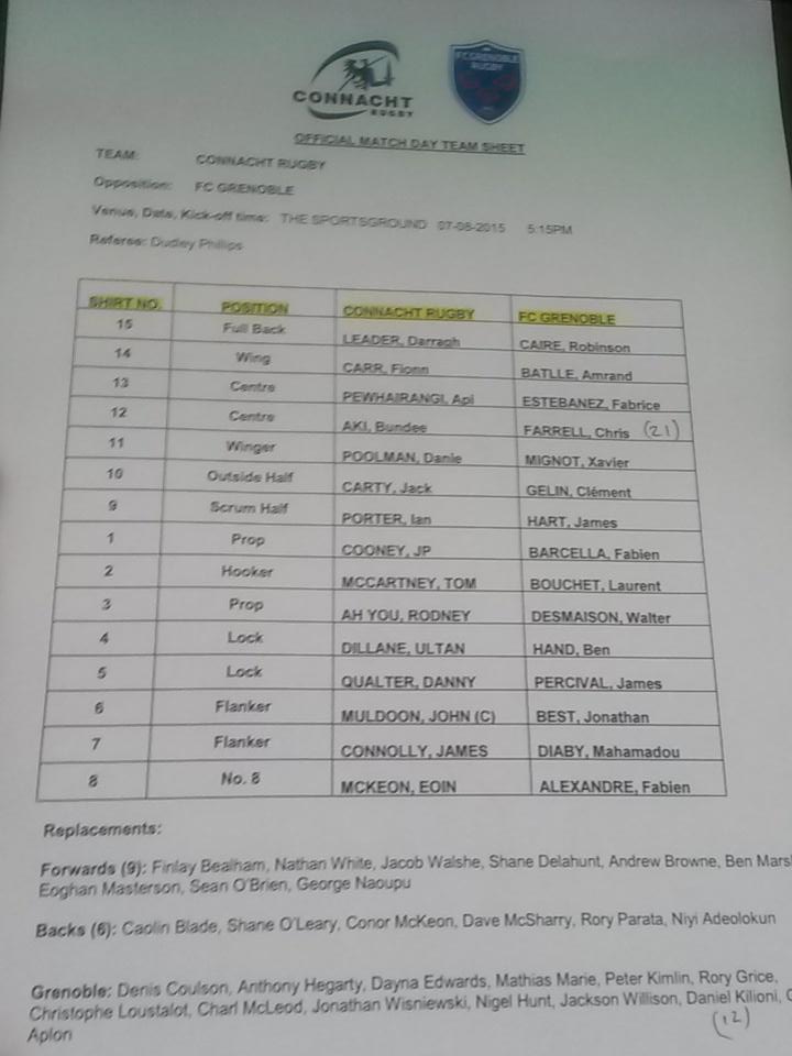 FC Grenoble : Fabien Barcella, Laurent Bouchet, Walter Desmaison – Ben Hand, James Percival – Jonathan Best, Mahamadou Diaby, Fabien Alexandre – James Hart, Clément Gelin – Xavier Mignot, Chris Farrell, Fabrice Estebanez, Amrand Batlle – Robinson Caire. Connacht : P. Cooney, T. McCartney, R. Ah You – U. Dillane, D. Qualter – J. Muldoon (c), J. Connolly, E. McKeon – I. Porter, J. Carty (McKeon, 31′) – D. Poolman, B. Aki, A. Pewhairangi, F. Carr – D. Leader. |
